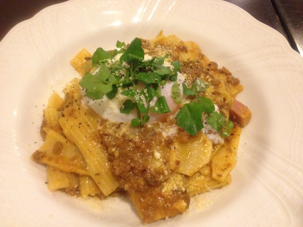 ショートパスタで半熟玉子が乗っていてソースも美味しい。